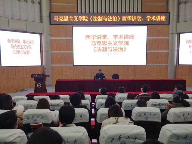 为增强大学生法制安全意识,增加法制与法治知识,提高自我保护能力,建设和平安全校园,2019年12月18日16:00,马克思主义学院在四教报告厅开展了以“法制与法治”为主题的专题讲座,特邀成都市公安局郫都区分局法制科一级警司吕亮同志莅临讲授。