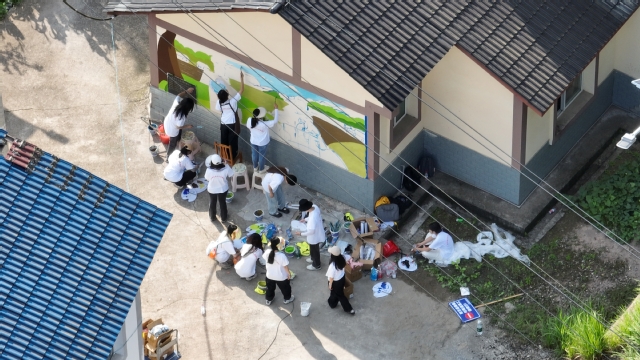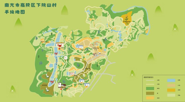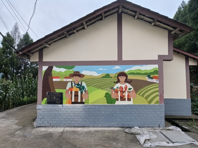 在新落成的下院山村党群服务中心旁,一幅色彩浓郁,充满特色风情和乡土气息的墙绘作品,成为村口上一道靓丽风景线。美术与设计学院实践队员在指导老师熊必刚、杨静东带领下进行实地走访,深入了解下院山村的地域特征、空间布局和特色产业,指导学生用画笔勾勒出充满农村生活气息、宣传乡村振兴的墙绘作品,制作完成乡村文旅特色地图,将美育服务于乡村建设。