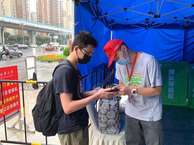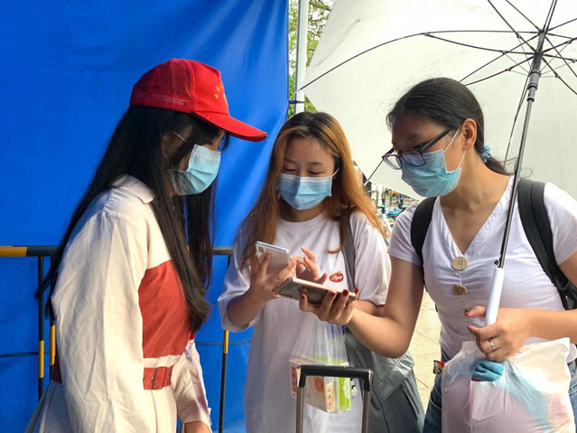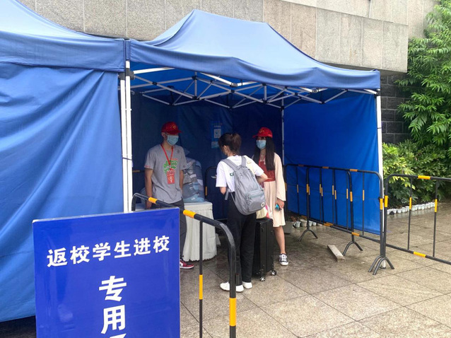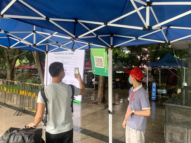 8月15日-17日,是我校第一批学生返校,本次返校学生约1.4万人。在校门口,志愿者们早早地来到南门和西门的志愿服务点,开始了一天的志愿服务,他们热情服务,耐心引导,在校门口负责审核返校学生本人的健康码是否为绿码是否有符合返校要求的返校凭证、并督促返校学生进校扫描二维码进行返校登记;在学校食堂,志愿者们协助食堂工作人员做好就餐的引导工作,他们在返校工作中用实际行动贡献自己的力量。
