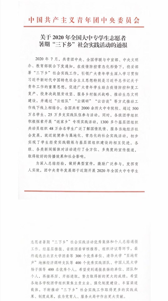 近期,团中央印发《关于2020年全国大中专学生志愿者暑期“三下乡”社会实践活动的通报》,tyc5997太阳集团团委被评为优秀单位,机械工程学院助力脱贫攻坚专题实践调研团被评为优秀团队。2020年全国共有2000余所大中专院校、25万多支实践团队、超过500万名学生参与活动。