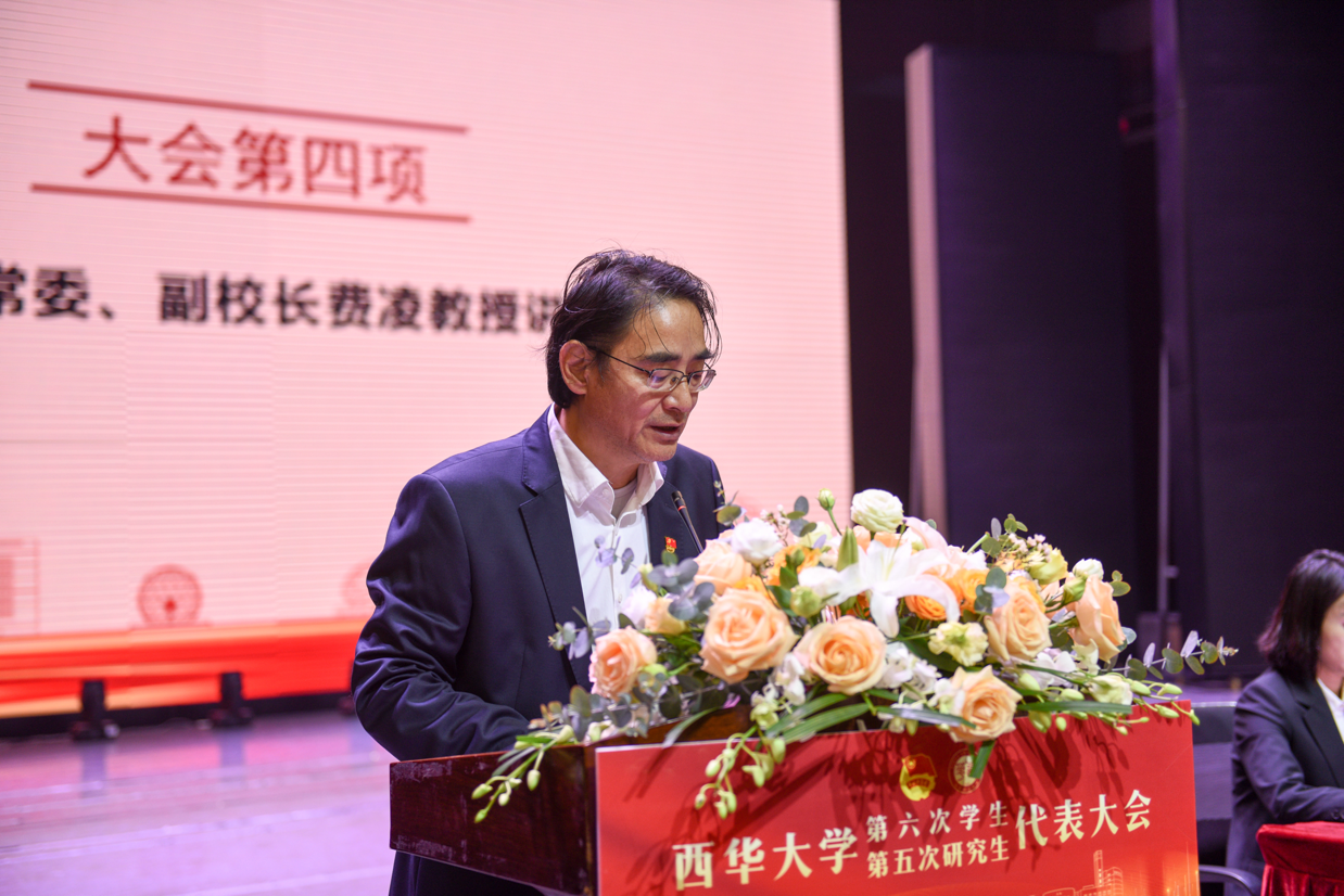 上午9:00,大会开幕式在庄严的国歌声中拉开帷幕。学校党委常委、副校长费凌对学生会和研究生会过去一年的成就表示热烈祝贺和高度赞扬,肯定其在学生思想引领、学风建设、活动组织、服务同学等方面做出的努力与贡献,并代表学校党委向全校同学提出四点殷切希望:一是要在学生优良学风建设中当好排头兵;二是要在学生思想政治引领中当好引导者;三是要在服务同学成长成才中当好实干家;四是要在全面加强自身建设中当好领头羊。