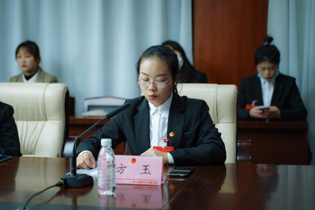 方玉同学作为新一届主席团成员代表进行发言,她说:“我很荣幸当选此届研究生会主席团成员,非常感谢各位老师、各位代表以及在座的各位同学对我工作的支持和肯定。我深知肩膀上的重任,我们要在继承和发扬研究生会优良传统的同时,更要在原本的基础上搭建新的舞台、开创新的局面。”