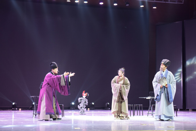 活动中,四川省曲艺研究院的艺术家们带来了多种形式的表演。演员赵剑带来的快板《哪吒闹海》将传统艺术与时下热点“哪吒”相结合,令现场师生耳目一新,让传统文化焕发出新的生命力;兼具传统与创新的琵琶与中阮《新十面埋伏》在演奏家的指尖下,将古曲的金戈铁马与现代编曲的张力完美融合;独幕剧《三顾茅堂》引用蜀地三国历史典故为背景,采用荒诞的黑色幽默的喜剧方式“借古喻今”,讽刺当今职场中的“形式主义”等不良作风,在欢声笑语中引人深思;四川盘子《蜀中诗酒曲》、四川金钱板《秀才过沟》、四川竹琴《银杏颂》、四川扬琴《锦城》、四川清音《古蜀风流》等节目通过现代与传统的融合,展示了四川曲艺的独特风格,传递了四川文化的深厚底蕴和艺术美感。