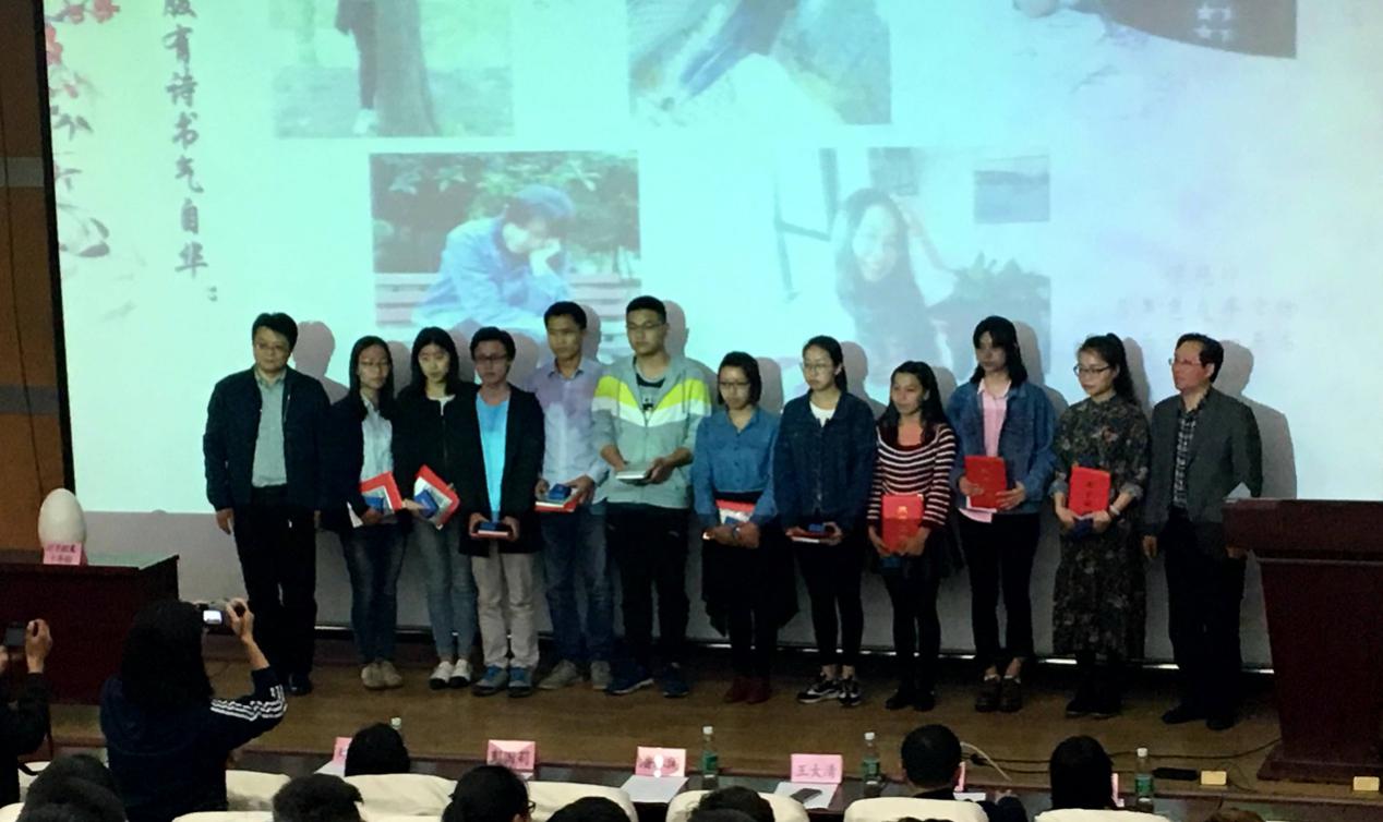 经过紧张激烈的抢答之后,仪式迎来高潮,即十佳读者的颁奖仪式。谭艳琼、左伟峰、王鑫等同学获得本次十佳读者的荣誉称号,现场出席的领导为获奖者颁发了证书和奖品。谭艳作为代表发表了讲话, 她谈及了自己平时阅读书籍的多少,阅读什么类型的书籍,以及自己平时生活学习中对细节的感悟与把握。并提醒大家在阅读时将现实与书本联系起来,以便更好地理解作品。阅读过程中,能感到更多心灵和精神上的满足。对于阅读的建议,她谈到:“每一本书籍都有它的生命力与魅力,潜心阅读,把自己日常生活中的感受带入到书本中,去体会作者的写作意图,定能读到作品背后的故事,得到思想上的升华。”