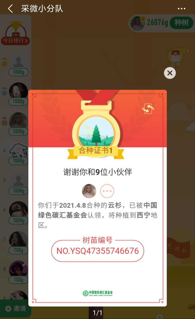 团队赛树苗领取证书截图