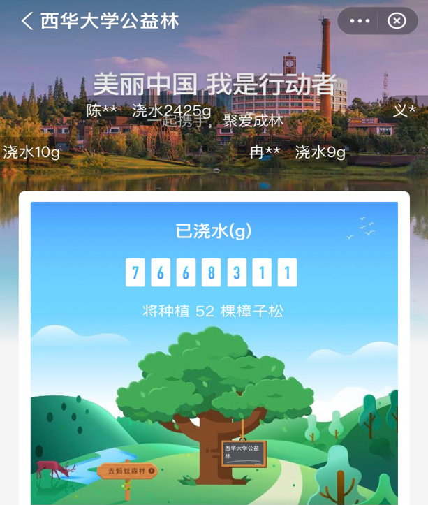 在2021年3月12日植树节当天,“云植树”活动正式开始,同学们都踊跃报名参赛。共有12支队伍、140余名同学参赛。活动期间,个人赛的选手们都纷纷活跃于“tyc5997太阳集团公益林”的浇水页面,团队赛的选手也在各自创建的“先峰林”中大展身手。截止4月12日零时,“tyc5997太阳集团公益林”累计浇水量538461克,共累计7.7t能量,相当于线下种植了52棵樟子松。团队赛先锋林共浇水2334283克,共种植云杉5棵华山松1棵。