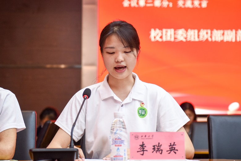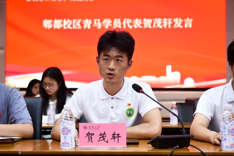 “青马工程”卓越班学员代表及学生干部代表们分别分享了学习心得和感悟。郫都校区“青马工程”卓越班学员代表贺茂轩提到,“青马学员的称号不仅仅是荣誉,更是沉甸甸的责任,希望我们青马学员能够充分发挥带头作用,传播党的声音,又当实践创新的‘排头兵’,在科技创新、志愿服务等领域主动担当。”学生干部代表樊志鹏简要汇报了五月份开展的主要学生活动,并讲到,“要深入贯彻此次习近平总书记重要回信精神,作为校团委学生社团管理部成员,一定要积极收集同学们的需求,结合实践行动为同学做实事,积极实现自我价值,提高青年人的服务品质、创新服务形式。”