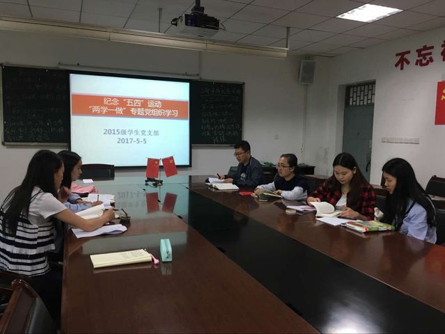 55日中午,外国语学院2015级学生党支部在外国语学院行政会议室开展了纪念“五四”运动暨“两学一做”专题理论学习会,六名预备党员和党支部书记梁正科老师参加了学习会。