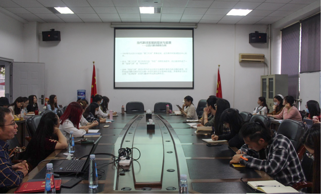何光顺教授从第三代诗到存在诗群的不同时期的内容特点入手,以四川新诗群体为例,详细讲解了当代新诗发展历程和前景。他以大量的诗歌作品为论据,重点论述了四川新诗的“陆地气质”。何光顺教授通过介绍诗歌南下和北上的历史,引出对新诗的多中心发展的讲述。在提到诗歌的小圈子化时,何光顺教授将四川新诗与其他地域的诗歌进行了简明对比,并得出了四川新诗更具内在美学品格,更具有历史感和沧桑感的结论。同时他指出,先锋性是四川新诗的艺术追求,通过分析四川新诗之先锋性能够看出华夏民族的美学精神。何光顺教授认为写诗是自我关心、自我休息、自我历练的过程,他鼓励同学们结合自身经历,积极创作诗歌,尝试不同的写作风格。何光顺教授的讲解生动有趣,同学们都听得聚精会神,并在结尾时踊跃提出自己的困惑和见解,现场氛围轻松活跃。