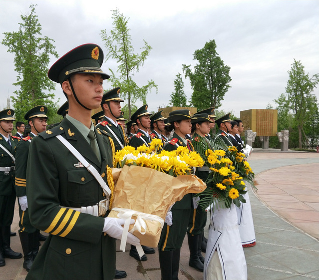 上午9时30分,公祭仪式正式开始。标兵就位,分别站立在台阶两边。仪仗队就位,持枪站立在人民英雄纪念碑前成一条直线。紧接着抬花篮的队员踢着缓慢而又沉稳的礼步走到纪念碑旁。七大高校国旗护卫队队员在队长和教官的带领下依次走到人民英雄纪念碑前。由四川大学锦城学院国旗护卫队军乐团演奏国歌,四位队员展国旗,全体敬礼唱国歌。然后由朗诵人员念悼词,“先烈忠魂在上,五星红旗在前.........血染红旗不倒,铸就红色之魂。”全体队员脱帽默哀三分钟。