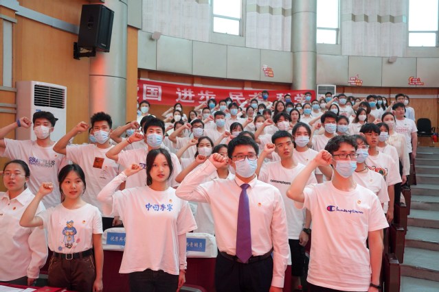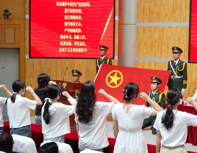 “我志愿加入中国共产主义青年团……”在校团委书记张雯欣的领誓下,全体参会团员面向鲜艳的团旗,举起右手庄严宣誓,心中充满着激动与自豪。