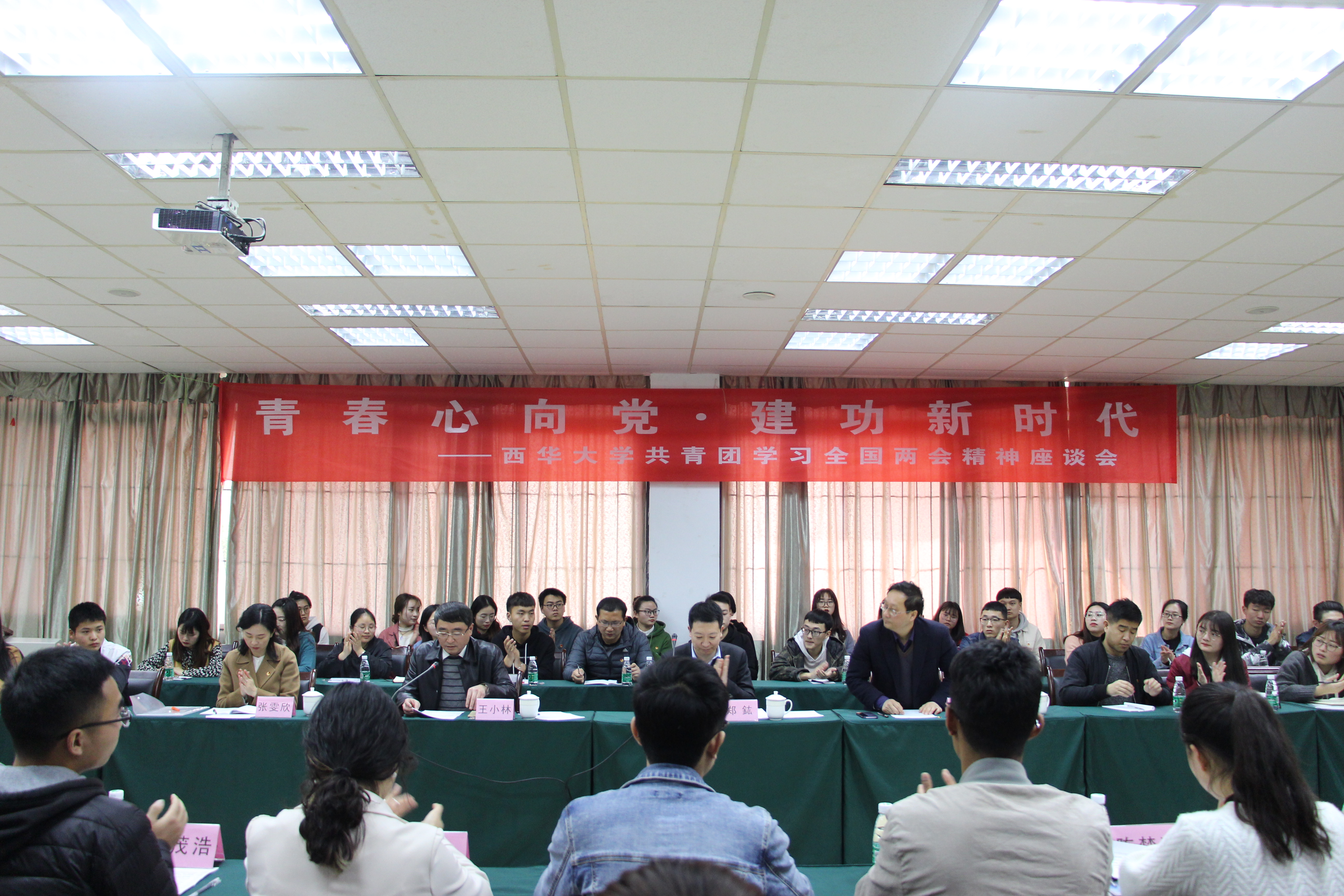 3月20日,为学习宣传贯彻全国两会精神,近距离帮助师生领悟内涵,务求实效,把学习宣传贯彻工作不断引向深入,tyc5997太阳集团团委在体育馆北会议室组织举行了tyc5997太阳集团共青团学习全国两会精神座谈会。出席本次座谈会的有:全国政协委员、致公党四川省副主席,tyc5997太阳集团副校长郑鈜,校党委副书记王小林,学工部部长王大清,校团委副书记张雯欣以及各学院团委书记,各学院各类学生代表。