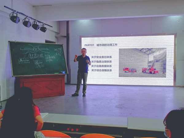 讲座伊始,丁鹏结合自身经历进行自我介绍。通过联系实际生活以提问的方式,了解同学们对本专业的熟悉程度以及对应急相关领域的看法。同学们积极参与,同时结合自身假期实习经历回答问题。接着,结合同学们关心的问题,从以下三方面--城市消防治理工作、国家综合性消防救援队伍简介、应急管理领域就业方向为同学们进行讲述。在第一部分丁鹏结合日常工作,从安全责任体系、隐患治理体系、应急救援体系、综合保障体系建设等方面,介绍了如何加强城市消防治理,筑牢城市安全底线。在第二部分丁鹏介绍了国家综合性消防救援队伍的职能和工作,以及国家综合性消防救援队伍招录有关情况。在第三部分丁鹏介绍了应急管理领域的就业方向及趋势,并鼓励同学们做好职业规划,加强基本功的学习。